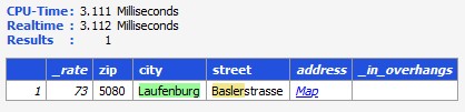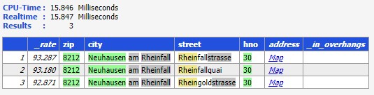 Bei dieser nahezu vollständigen Suche, wird eine Auswahl über 3 Straßen in Neuhausen geliefert. Bei jedem Datensatz werden die übereinstimmenden Begriffe markiert (Highlighting). Über die Farbe kann die Kategorie der Übereinstimmung angezeigt werden: identisch (grün) oder fehlertolerant (gelb). Weitere Informationen aus den Referenzdaten werden grau hinterlegt. Die Suchzeit beträgt bei diesem Beispiel etwas mehr als 15ms. In dem Projekt wird in der Ergebnisliste zu jedem Datensatz der passende Link zu Google-Maps generiert, welchen ein Anwender bei Bedarf selektieren kann.