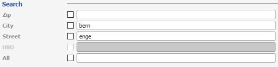 In diesem Beispiel möchte der Anwender in „Bern“ die „Hintere Engehaldenstrasse“ selektieren. Der routinierte Call-Center-Mitarbeiter würde „bern“ für „Bern“ und „enge“ als Suchbegriff für die Straße eingeben und erhält in einer kompakten Trefferliste den gewünschten Datensatz: