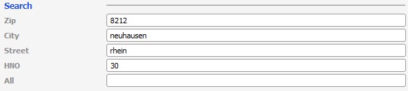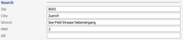 Eine nahezu vollständige Suche mit PLZ, Ortsname, Straßenname und Hausnummer: