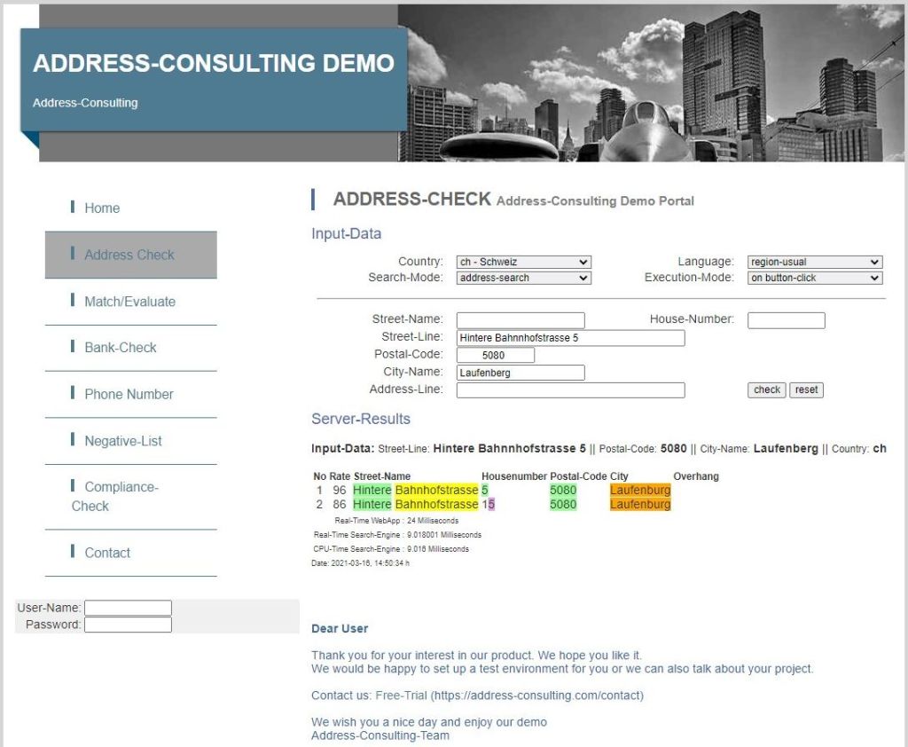 Address-Consulting hat eine Demo für einen Address-Check auf Schweizer Referenzdaten online gestellt. Die Demo erreichen Sie unter folgender Adresse: