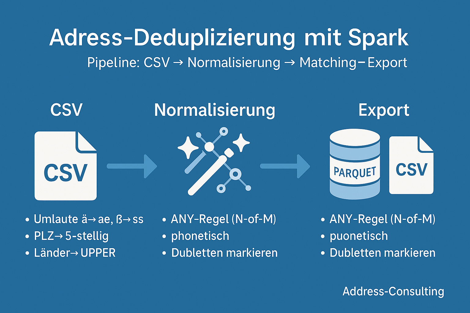 Von der Idee zum funktionierenden Big-Data-Projekt: Eine praxisnahe Reise durch die Dubletten-Erkennung mit PySpark. 1. Warum Dubletten-Erkennung? Kundendaten sind das Herzstück vieler Unternehmen. Doch in großen Beständen lauert ein Problem: Dubletten.Ob doppelt erfasste Adressen, fehlerhafte Schreibweisen oder unvollständige Datensätze – sie verfälschen Analysen, treiben Kosten in die Höhe und können sogar Compliance-Risiken nach sich ziehen.„Dubletten erkennen mit Apache Spark – eine Skizze unserer Projekt-Reise“ weiterlesen